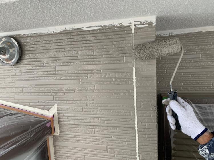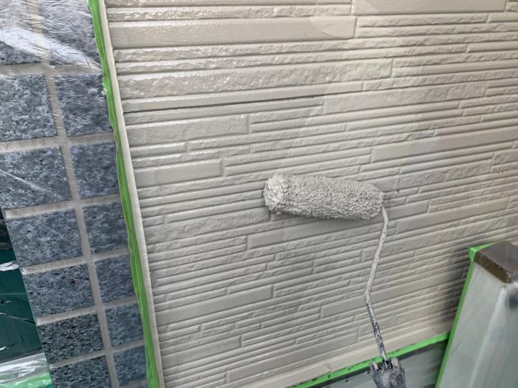 カチオンシーラーで下塗りを行った外壁に仕上げのトップ塗料をローラーで塗布していきます。