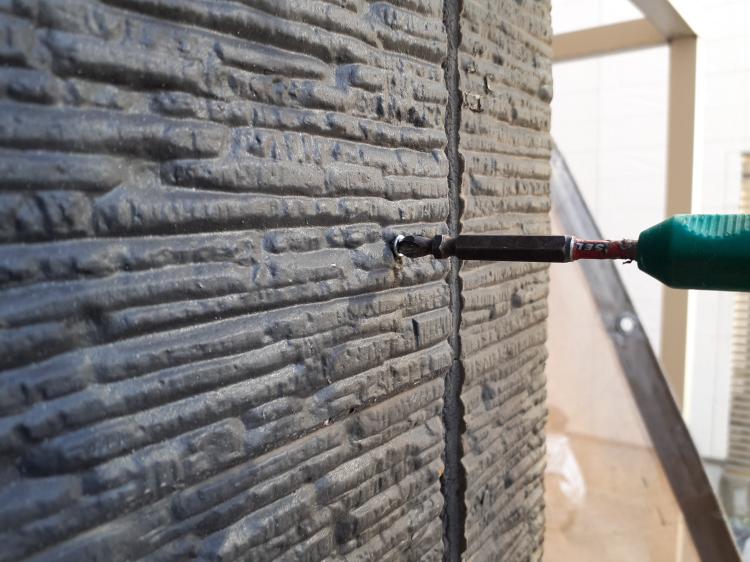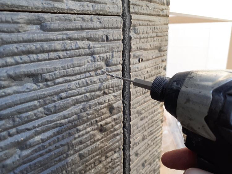 箇所を確認し、まずは下穴を開けます。いきなりビス打ちするとサイデイングが割れてしまう